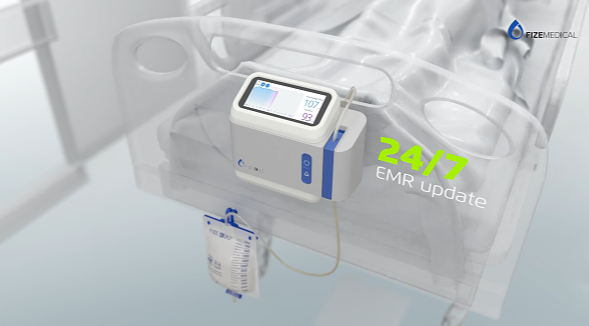 Unlike a manual urinometer where urine is drained by a constant sub-pressure applied to the bladder by gravity, the FIZE kUO sensor detects urine and enables its drainage by the application of an adaptive sub-pressure, comparable to that of a manual urinometer.